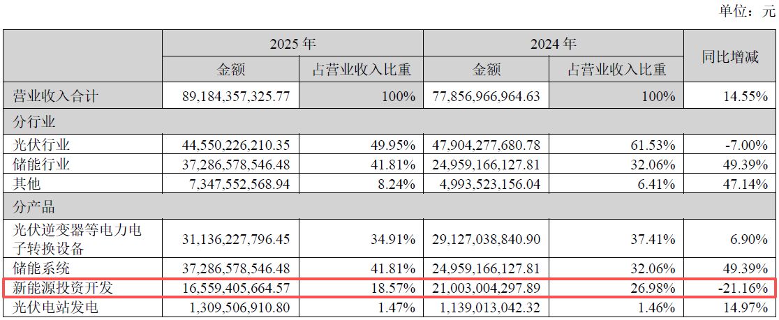 尽管储能系统业务期内表现亮眼,但阳光电源光伏逆变器面临出货量与营收双降压力:作为传统核心业务,光伏行业2025年实现营业收入445.5亿元,同比下降7%;光伏逆变器全球发货量为143GW,较上一年的147GW下降了2.72%。